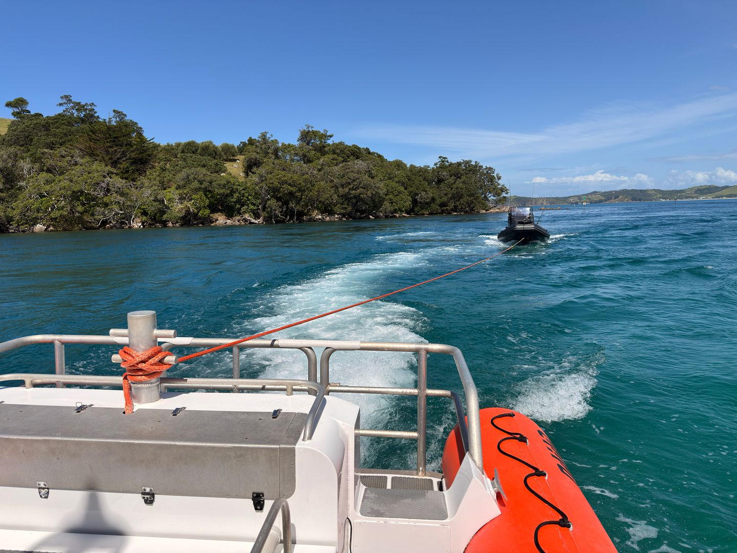 The callout was to a black RIB with a flat battery and a position just off the South end of Little Barrier. Obviously, with the restrictions on anchoring in that area, they were drifting, but we found them relatively quickly not far from the position they had conveyed to Ops.